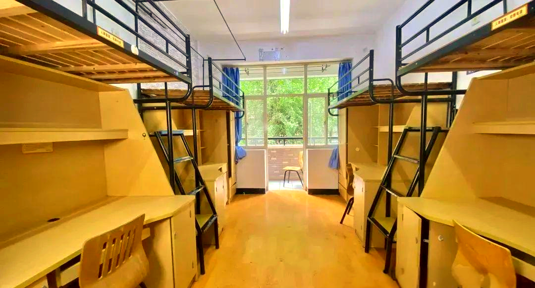 目前本科新生基本为四人间,主流为上床下桌结构,每人配备床铺(90cm×200cm)、书桌、衣柜和储物柜,空间布局合理,够用不拥挤。