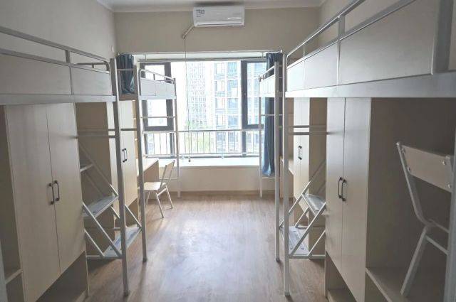 本科新生统一四人间,全部上床下桌。每人一张床(90×200cm)、一套桌椅、一个衣柜、一个储物柜,空间够用,不会太挤。