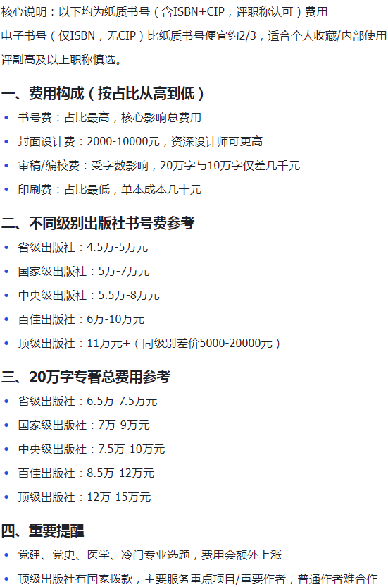 另外一定要分清纸质书号和电子书号。我们上面说的价格,都是带ISBN和CIP核字号的正规纸质书号费用,这也是评职称认可的类型。电子书号只有ISBN、没有CIP,属于电子出版物,价格比纸质书号便宜约三分之二,但多数单位评副高及以上职称不认可,只适合个人收藏或内部使用。
